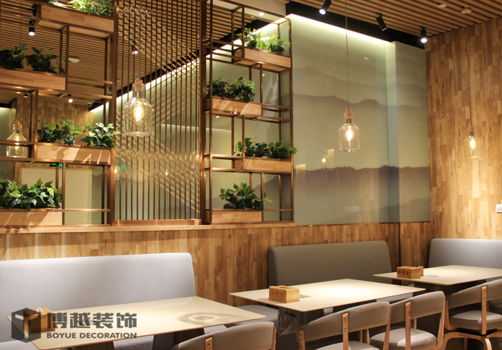 现代感极强的餐饮空间,地面的铺装使整个空间更加时尚,有调调,尤其木色与白色之间的跳色更灵动活泼。顶面的滑轨射灯设计我觉得很科学,可以根据需求将其随意滑动,调制适应的位置,而且光不够可以随意增加,而独立安装的射灯恐怕就没有这么便捷的了,暖暖的光源照在美美的小龙虾上面,吃货们应该更有食欲吧。门头内侧的灯带时候来深化时增加的,这条光加的真的很好,使明明暗淡又简单的白色乳胶漆墙面有虚实的变化,也使整个空间的光线更加的温馨明亮。绿植的确是个美化环境的最佳配饰,整个空间有绿植的衬托更加生动有色彩。